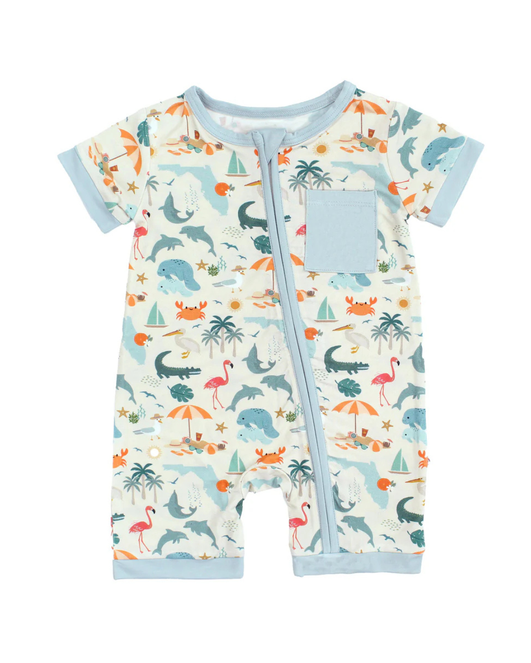 The softest bamboo shortie romper in our Florida state print! Celebrate the state of Florida and all of its iconic imagery, perfect for Floridians and visitors alike. Don't forget to see other styles in this print for a cute sibling match!